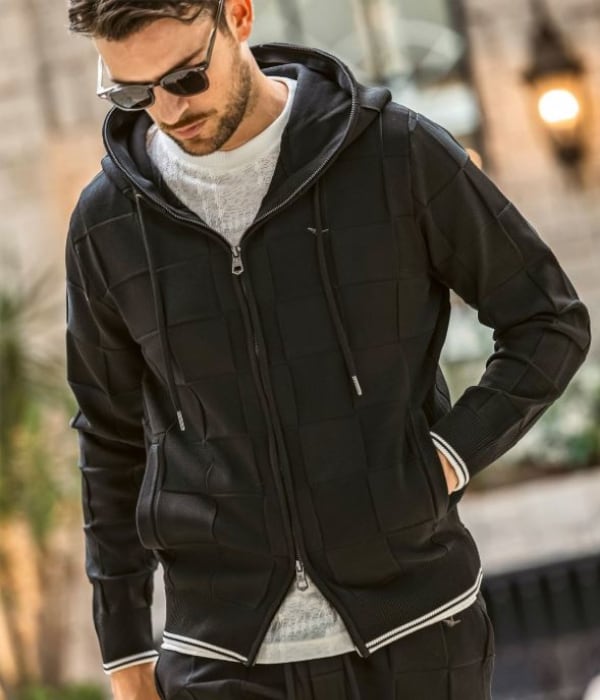 編み込んだような立体的なブロックデザインがクラス感を漂わせる、オリジナルテキスタイルで仕立てたセットアップ。