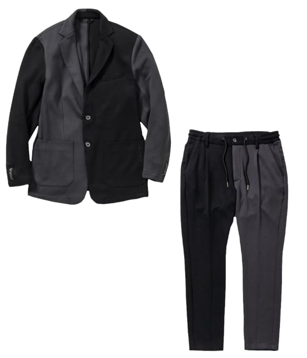 上下アシンメトリーになる配色でラグジュアリーなセットアップに仕上げています。