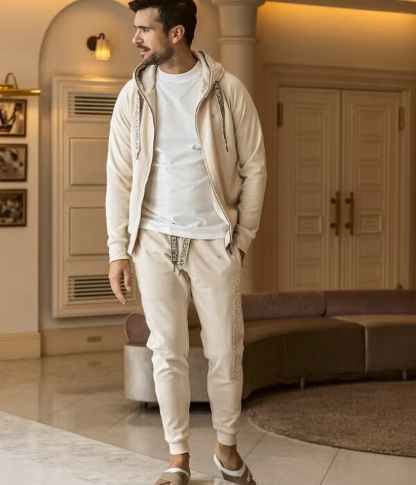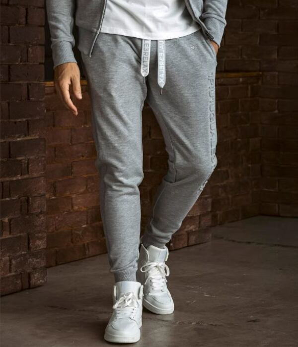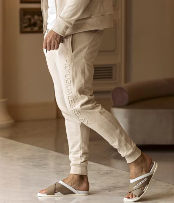 左サイドに大胆に配したエンボスロゴが目を惹くスウェットパンツ。