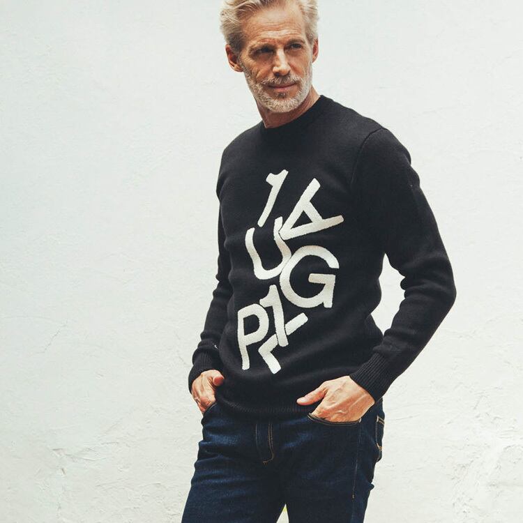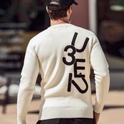 前後にブランドロゴをランダムに散らしたスポーティな面持ちのニットトップス。立体的なサガラ刺繍が表情豊かな高級感を生むアクセントに。
