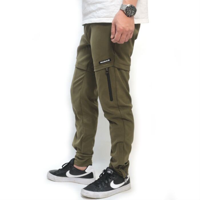 シルエットは、腿部にややゆとりを持たせながらも膝下からはキュッと細身に絞り、全体にややスリムめなサイジングですが、ウエスト部はドローコード調節可能なゴム仕様&裾ファスナー付なので、生地自体のストレッチ性に加えて更にリラクシングな着心地に。