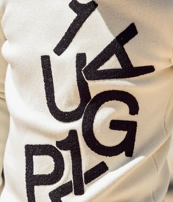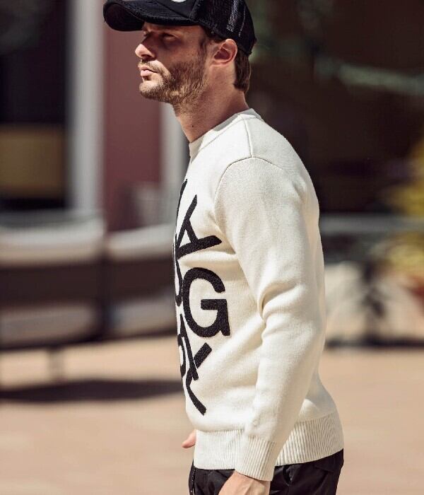 前後にブランドロゴをランダムに散らしたスポーティな面持ちのニットトップス。立体的なサガラ刺繍が表情豊かな高級感を生むアクセントに。