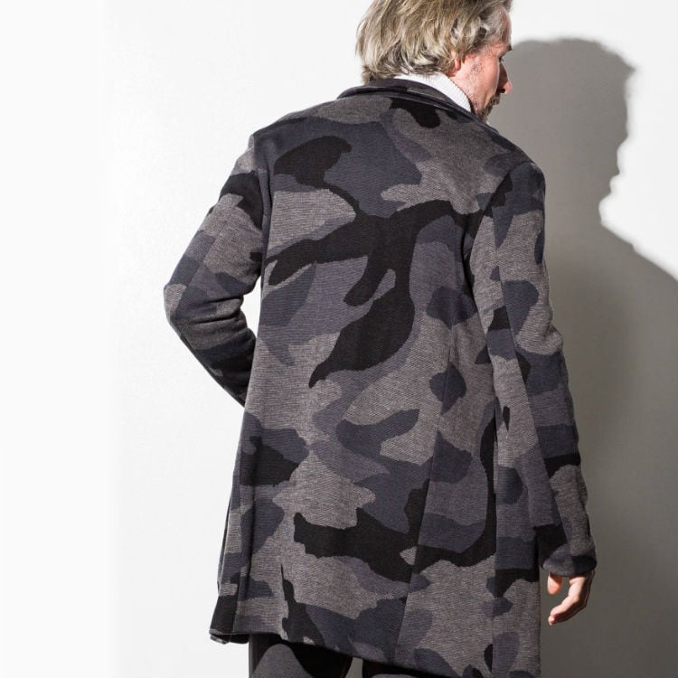 ブランドオリジナルのカモフラージュ柄を全面に使用したウール混ニットのチェスターコート。