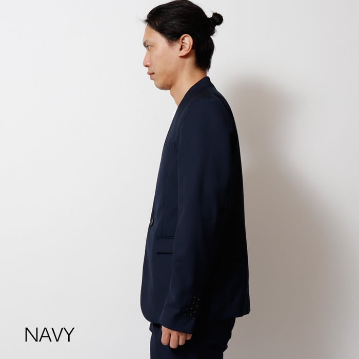 レーヨンの上品な素材感が魅力的なテーラードジャケット。 カジュアルなスタイリングにもマッチするノーカラータイプを採用。 インナーにシャツやカットソーを合わせ、様々なシーンで活躍する一着です。 同素材のパンツでセットアップでの着用もおすすめ。