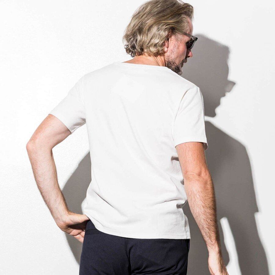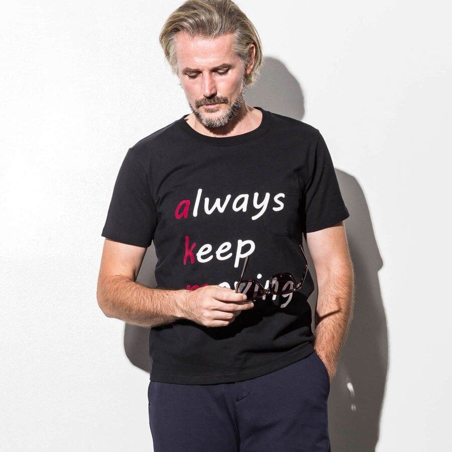 AKM Contemporaryからメッセージプリントがデザインされたポケット付Tシャツ。