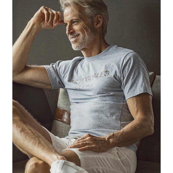 フロントにラインストーンでブランドロゴを配置したカットソー。大小散りばめたラグジュアリーな輝きが大人のカジュアルウェアを格上げします。