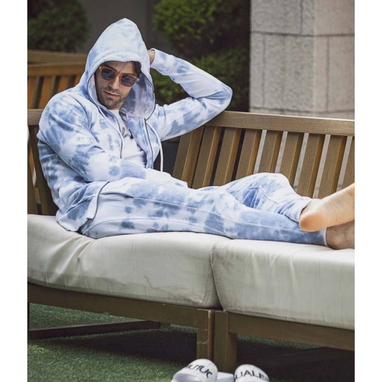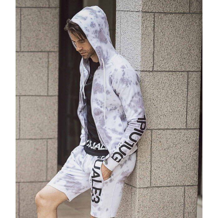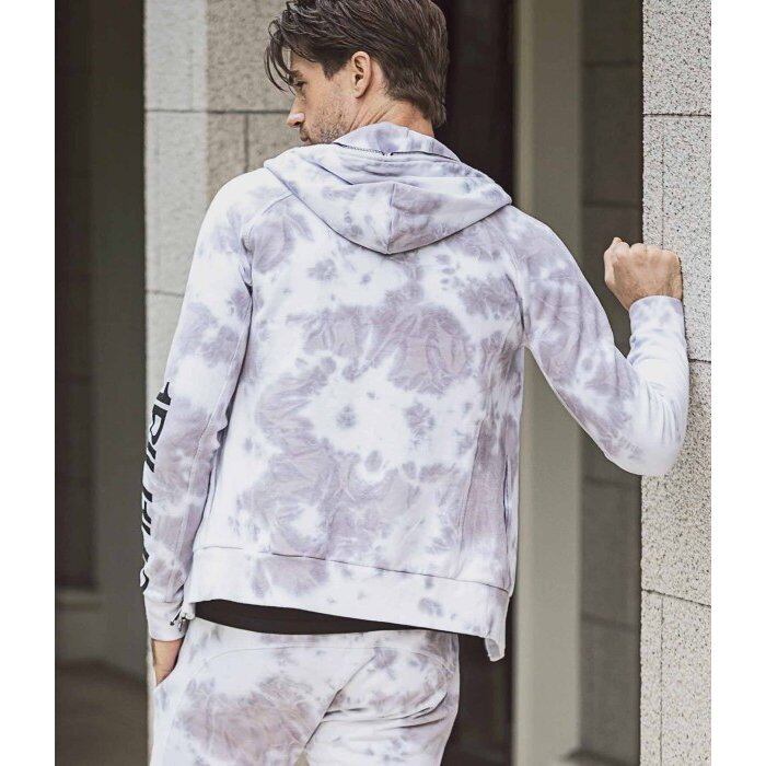 淡いカラーリングのタイダイ柄がシーズンらしい清涼感を齎すジップアップパーカー。左袖に配置したブランドロゴがキャッチーなアクセントに。