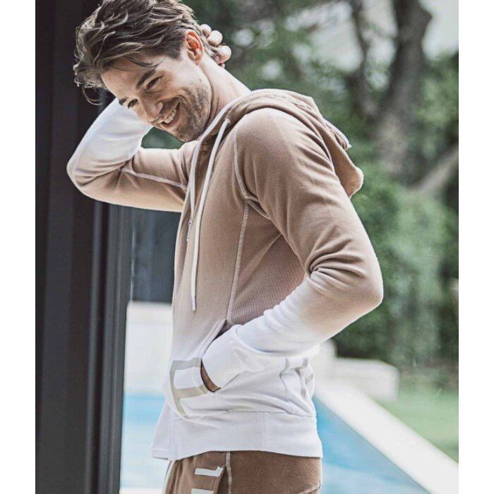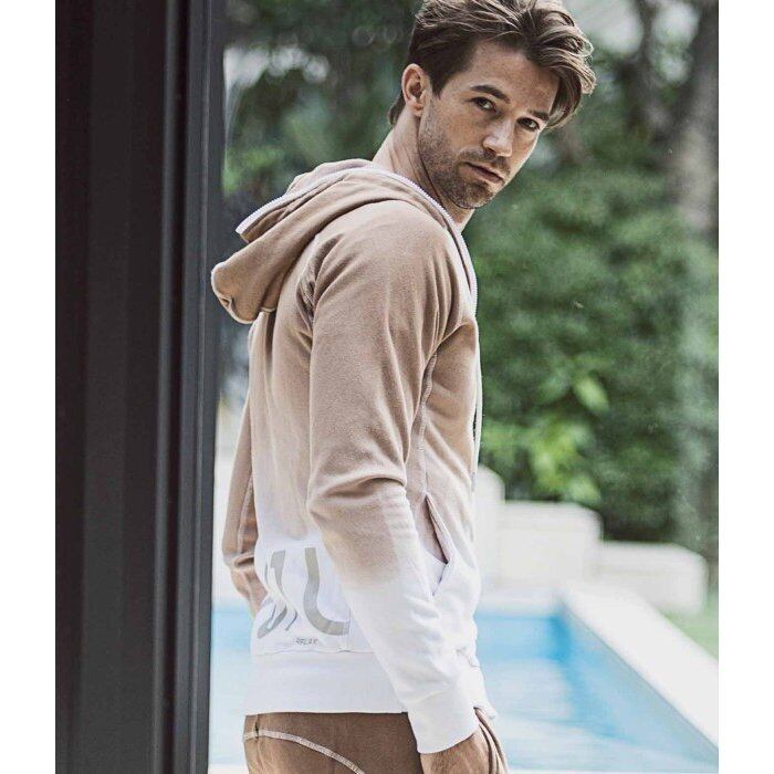 濃色からホワイトへと流れるようなグラデーションが鮮烈なインパクトを及ぼすジップアップパーカー。色を重ねて染めていくオーバーダイ加工を手作業で施し、他にはないユニークな風合いを実現しました。