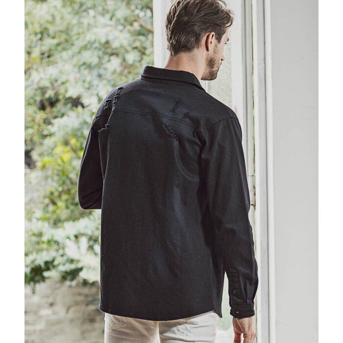 サイドにブランドロゴをあしらったスポーティな印象のデニムシャツ。大胆なクラッシュ加工が抜け感を演出しながらも、当て布を施すことで上品な大人の表情に格上げ。