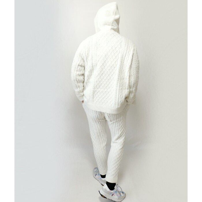 パンツはサイドで切り替えた編地が縦のラインを強調し、スマートなシルエットに仕上げてくれます。