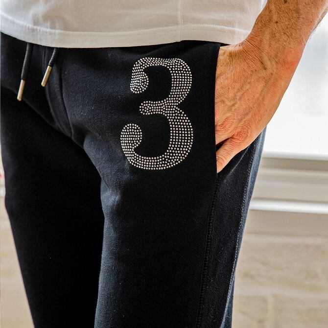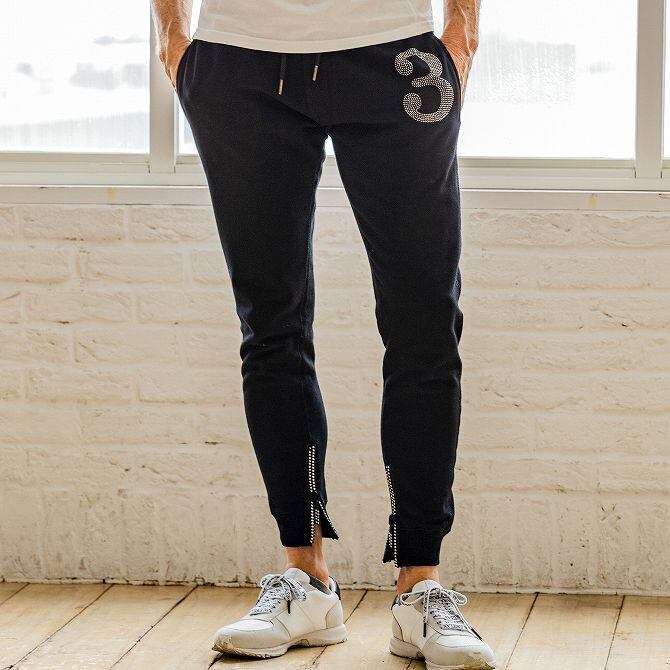 ブランドを象徴する数字の「3」をラインストーンで描いたデザインが特徴的なスウェットジョガーパンツ。
