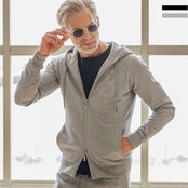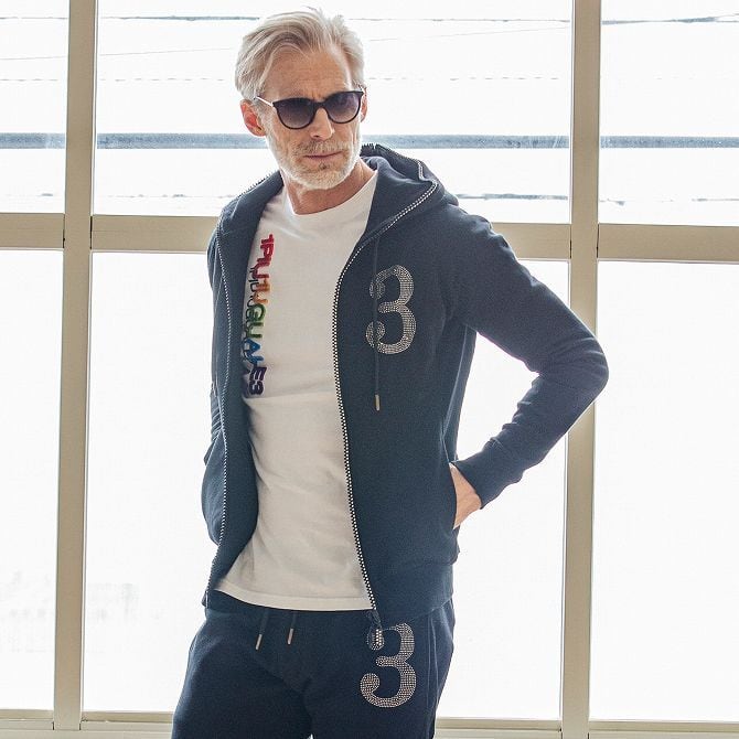 ブランドを象徴する数字の「3」をラインストーンで描いたデザインが特徴的なスウェットフードパーカ。