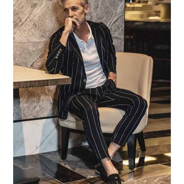 ジャケットのブランドオリジナルのシルエットはゴージラインを高めに設定したイタリアンなハイゴージ仕様。上品なピンストライプと相俟ってシャープな印象をプラスし、大人の休日スタイルを格上げ。