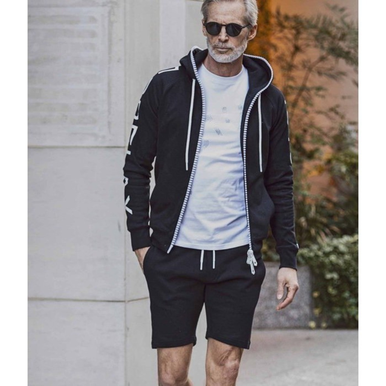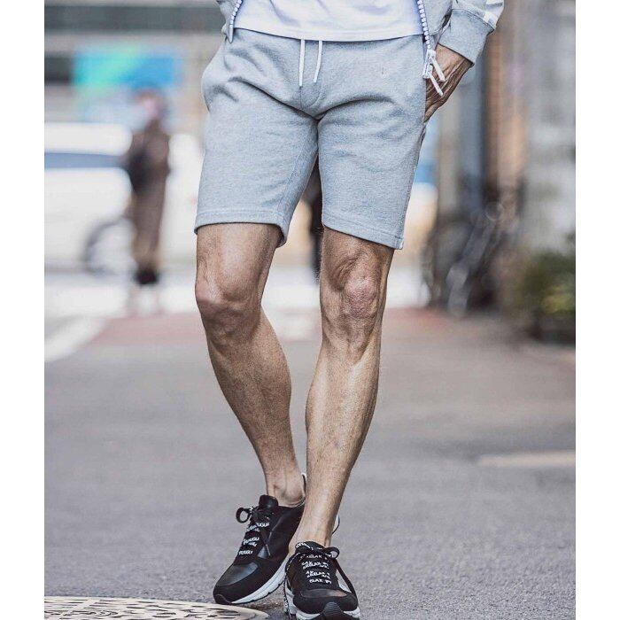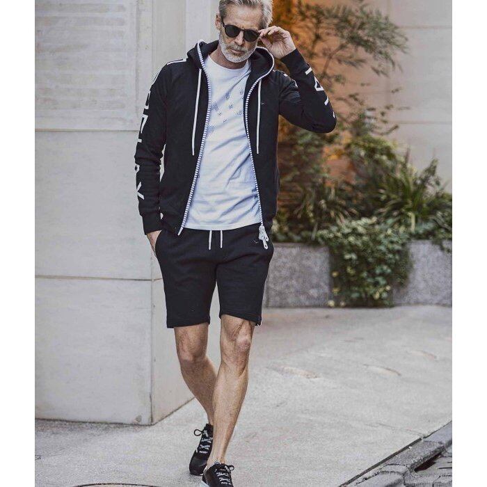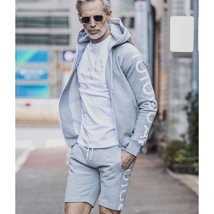 パーカーの袖、パンツのサイドにはブランドロゴを大胆に配置。カジュアルな中に軽快な表情を併せ持つ仕上がりに。