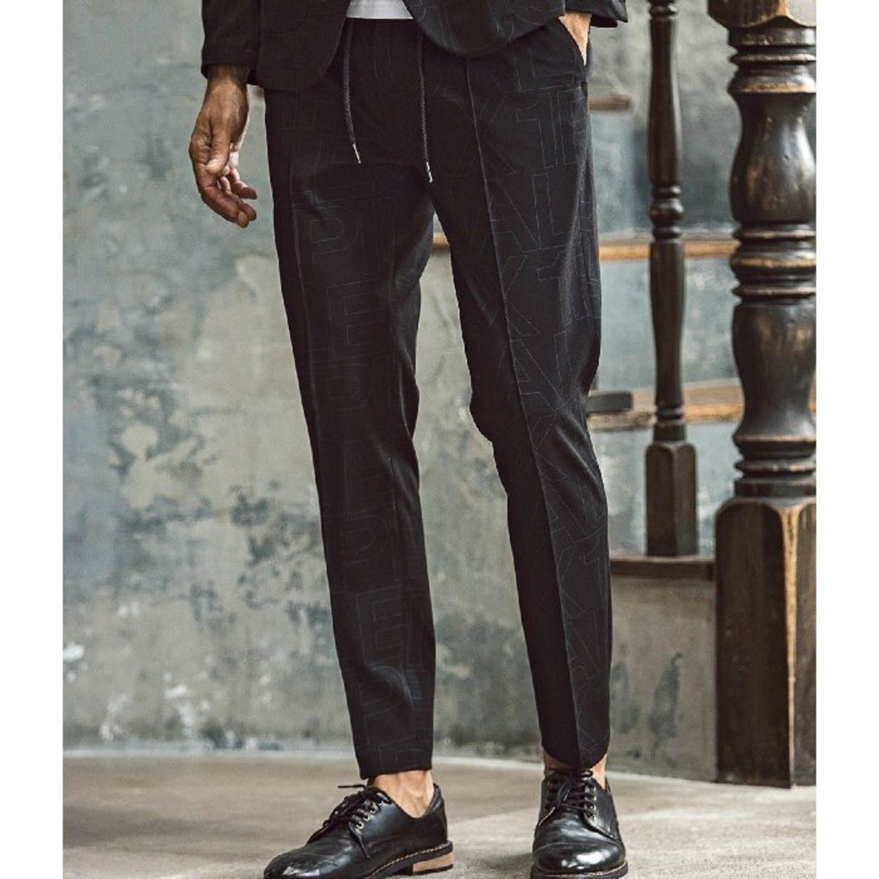 オリジナルで作成した中抜きロゴを総柄で印象的に使用したスラックス。センターにピンタックを施した王道のシルエットですっきりとしたスマートな着こなしを叶えます。