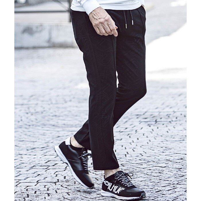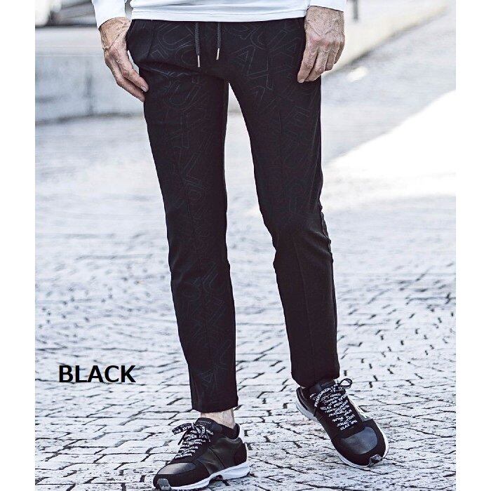 オリジナルで作成した中抜きロゴを印象的に使用した総柄のスラックス。センターにピンタックを施した王道のシルエットですっきりとしたスマートな着こなしを叶えます。