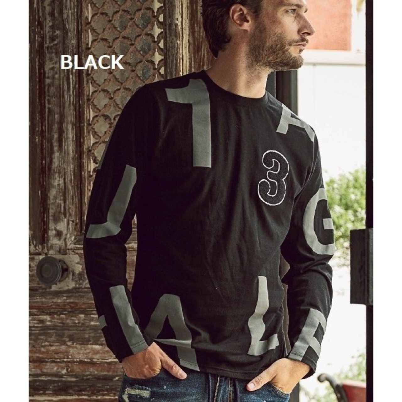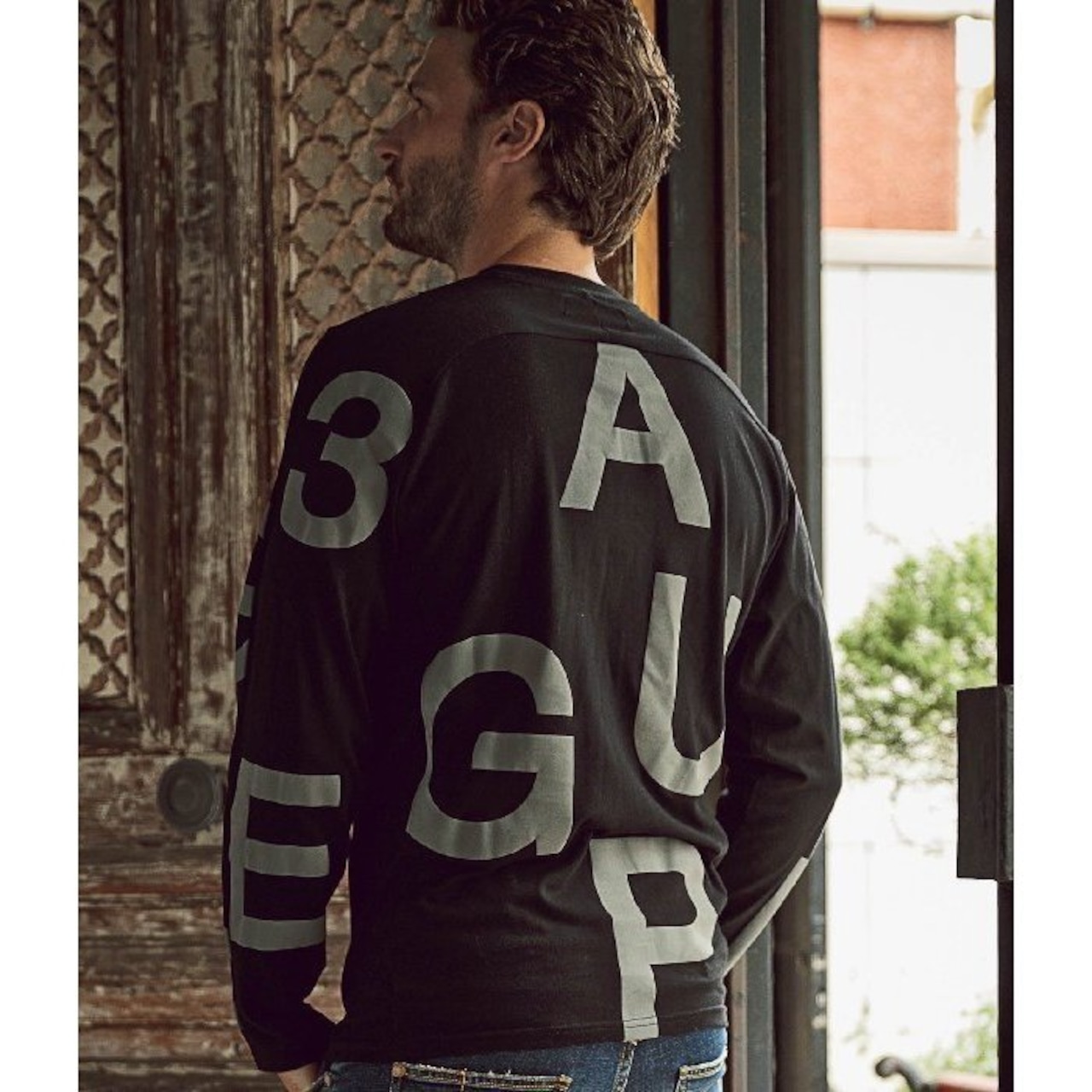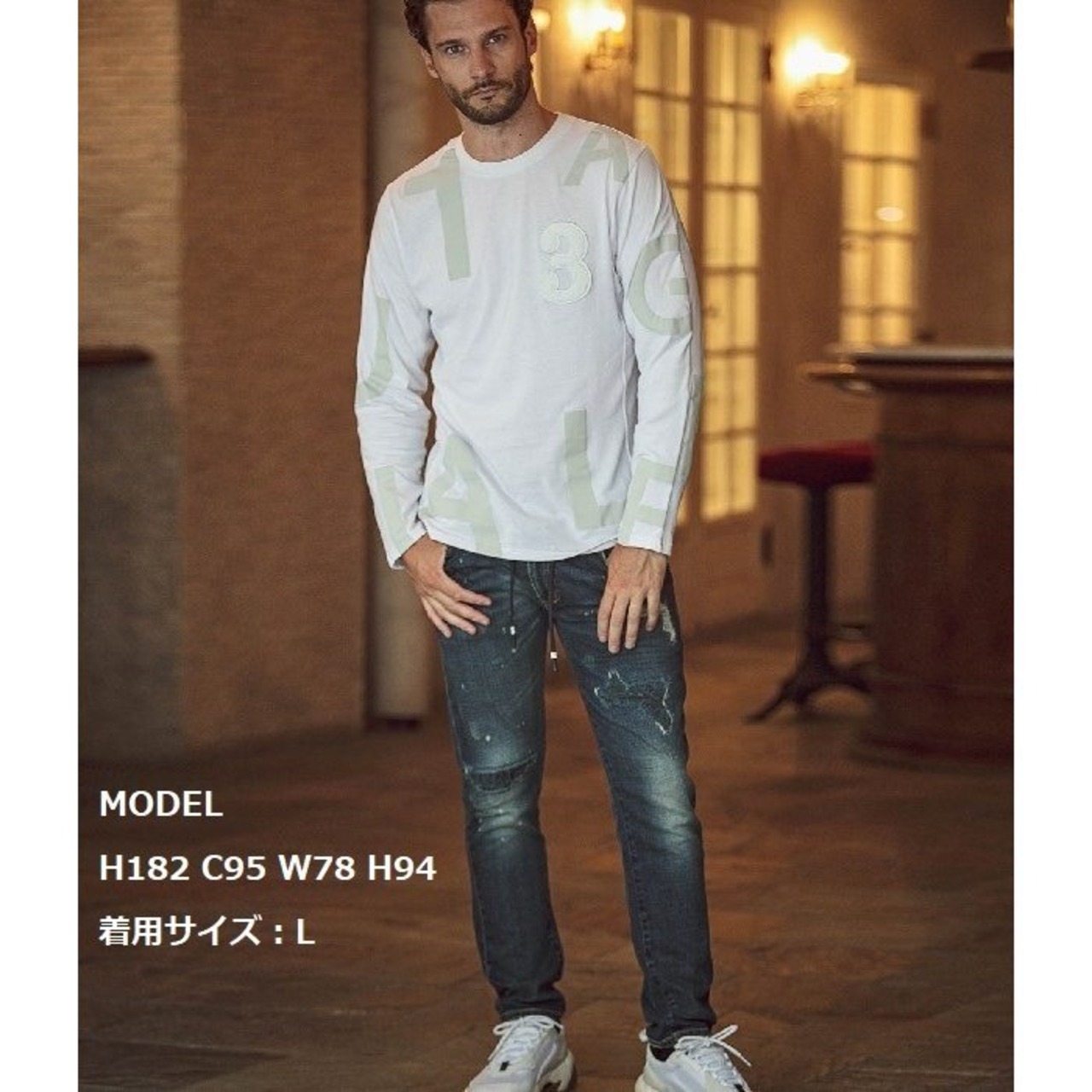 ブランドロゴをランダムに散らしたアクティブな長袖Tシャツ。胸元にはブランドを象徴する数字の「3」を立体的なサガラ刺繍で表現。