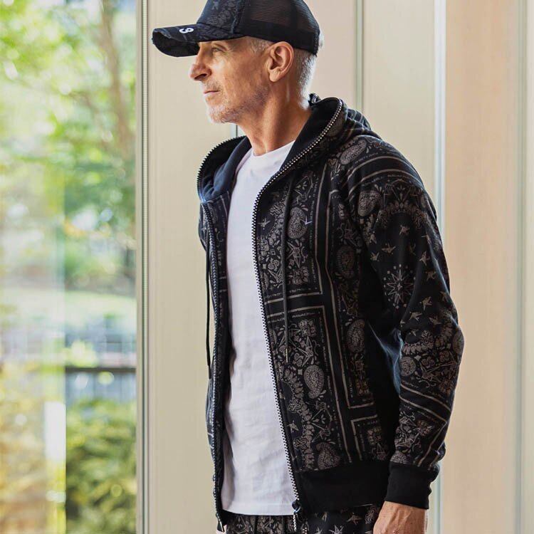 1PIU1UGUALE3 RELAX ウノ ピュ ウノ ウグァーレ トレ リラックス メンズ ペイズリー柄裏毛ジップパーカー メンズ スウェットパーカー ラインストーン ジャージ