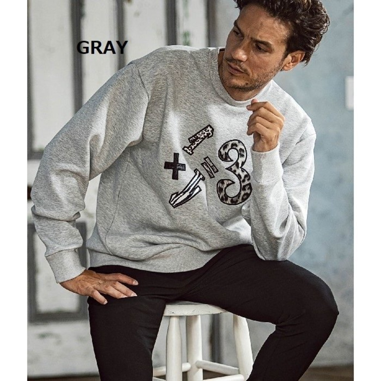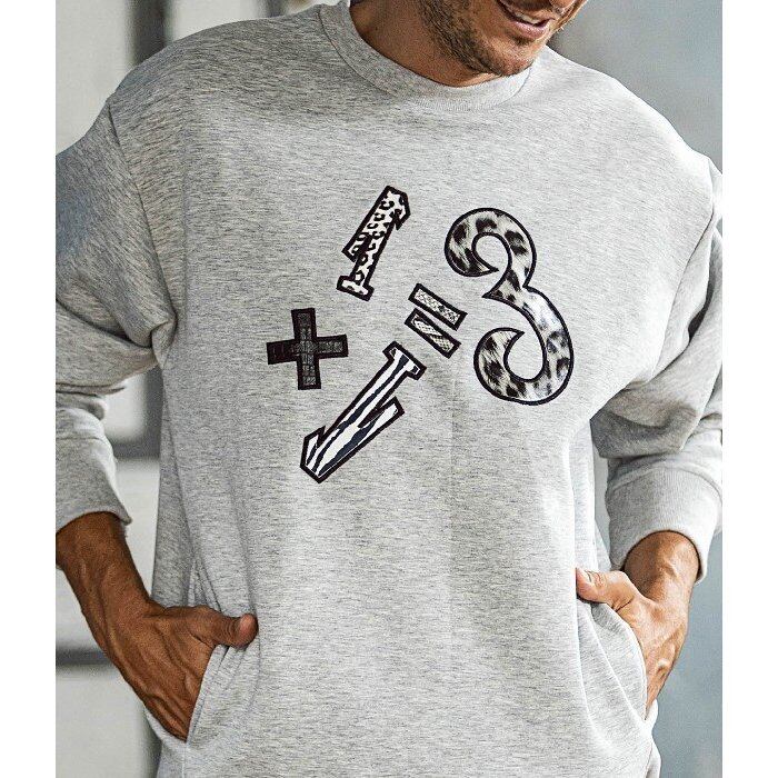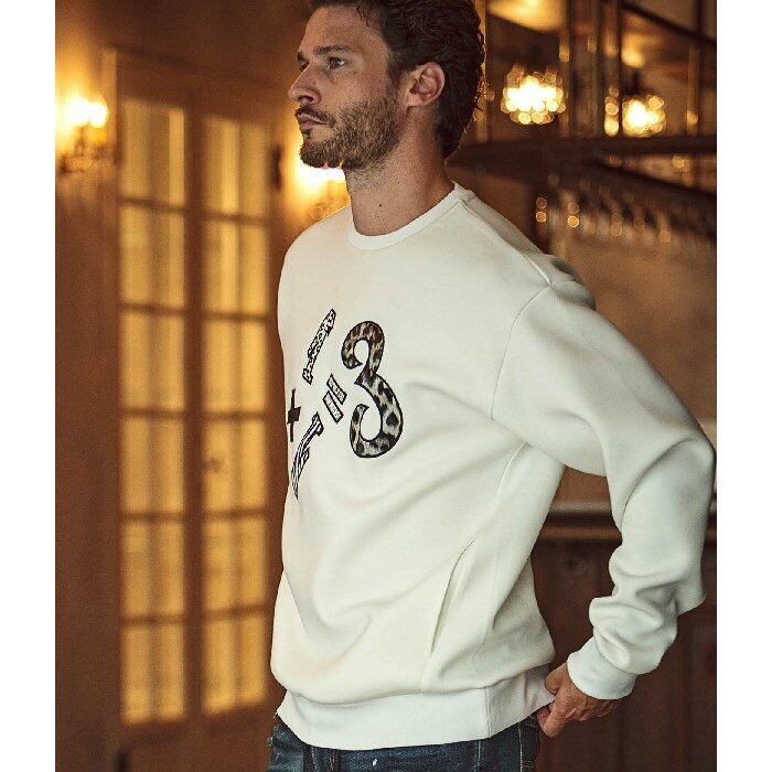 ブランド名の意を持つ「1+1=3」を配したスウェットプルオーバー。ロゴ部分をアニマル柄にすることで立体感と表情豊かな遊び心を引き立てます。