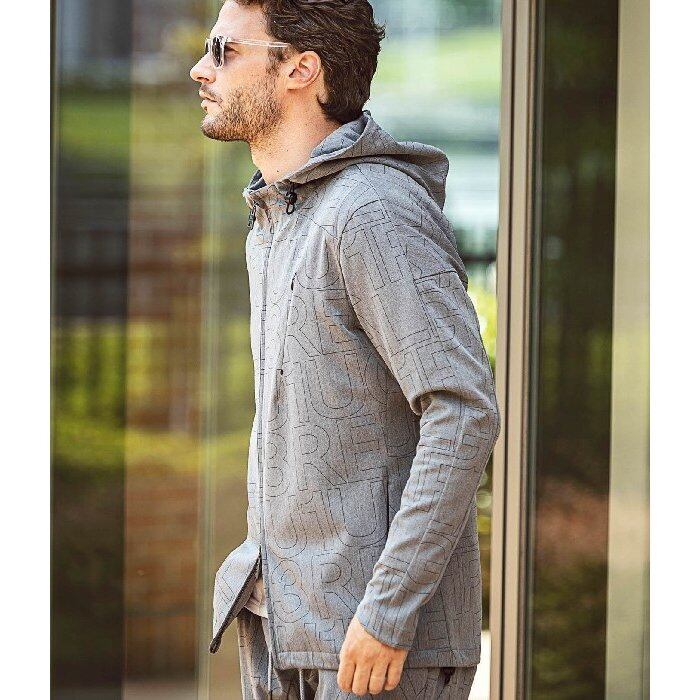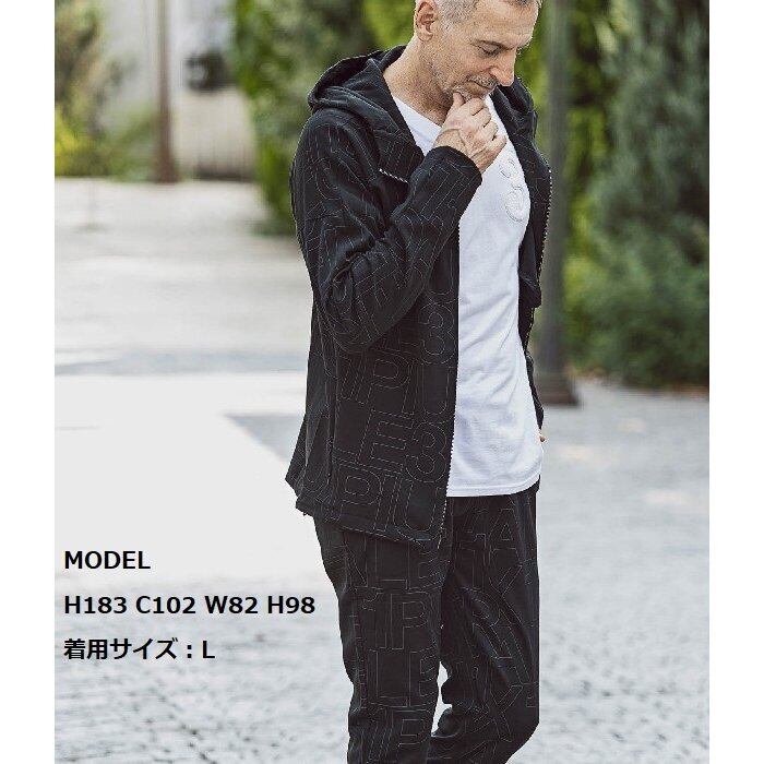 オリジナルで作成した中抜きロゴを印象的に使用した総柄のパーカー。動きに合わせて伸縮するストレッチ素材を採用し、ストレスフリーな着心地を保持しています。