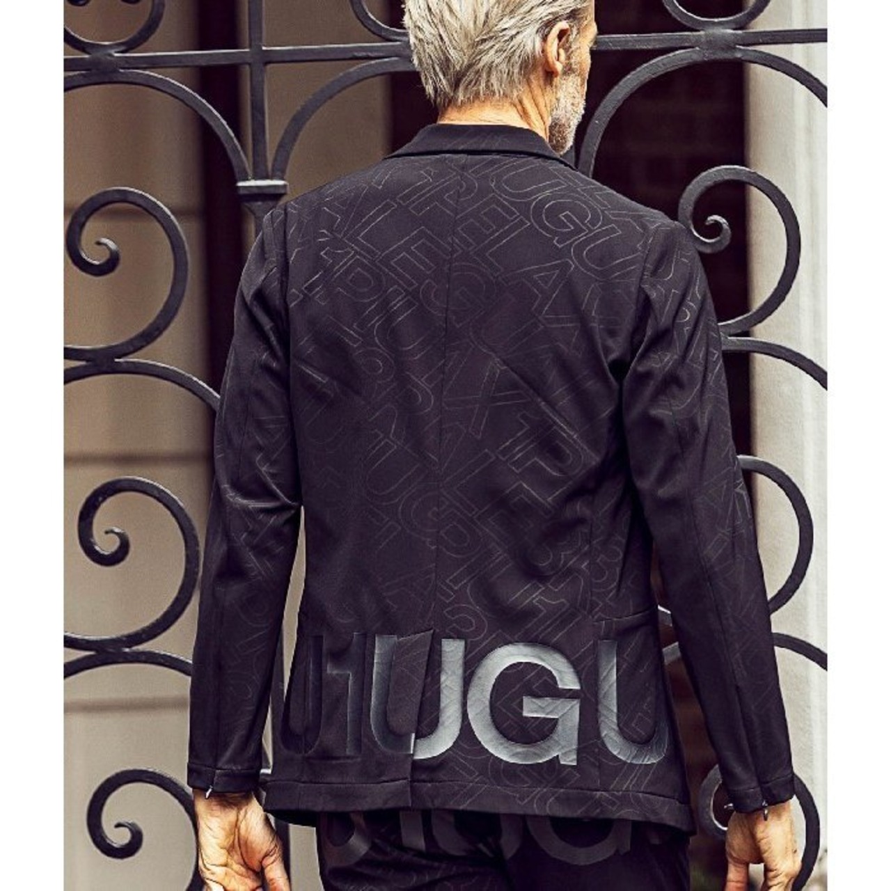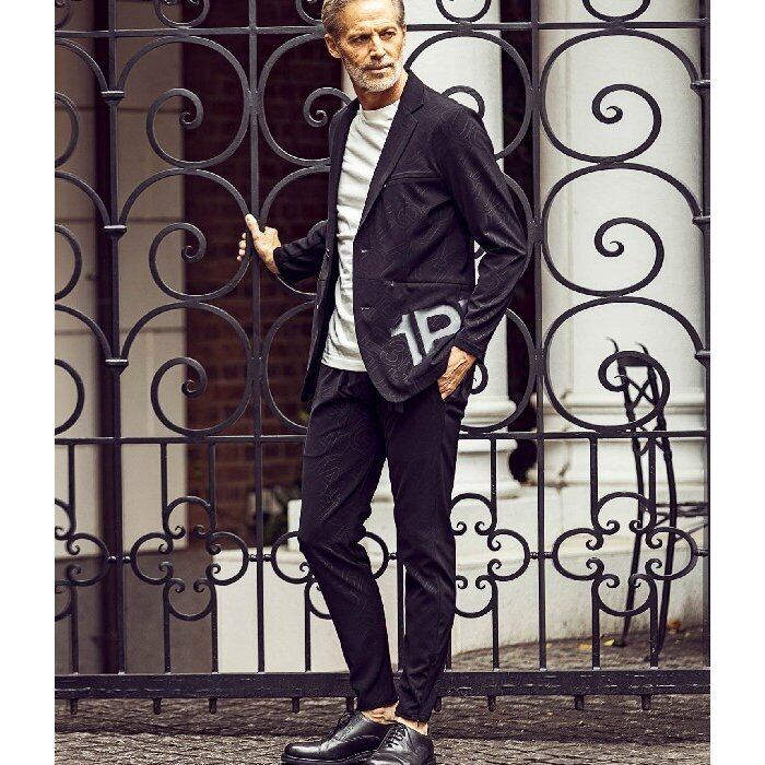 オリジナルで作成した中抜きロゴを印象的に使用した総柄のジャケット。シングルボタンで王道のシルエットがすっきりとしたスマートな着こなしを叶えます。