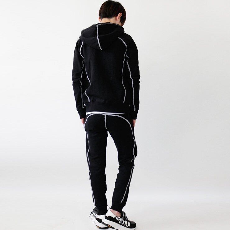 パーカーのフロント・パンツの裾にはきらりと輝くアイキャッチーなラインストーンジップで彩りをプラス。