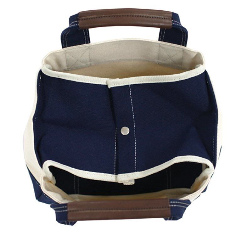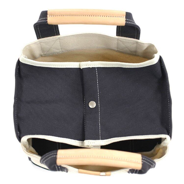 太いステッチでステッチワークをきかせて、ツールバッグのイメージをだしています。 内側の両サイドからフラップをだしており、中央部分をホックで止めれば 中身が見えない形になります。 内側のポケットは両サイドに配置。内側も配色のポケットにしています。 底部分は2枚合わせで作成しているためしっかりと、立ち上がるトートバッグになります。 工具や本などを収納できるバスケットとしてもご提案できると思います。