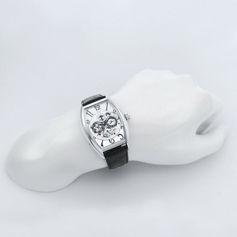 一目で認識可能な月・日・曜日のトリプルカレンダーと24時間表示が特徴です。 全てのインダイヤルがフルスケルトン仕様でムーブメントが堪能でき、高級感を演出する精密なギョーシェ模様になっています。