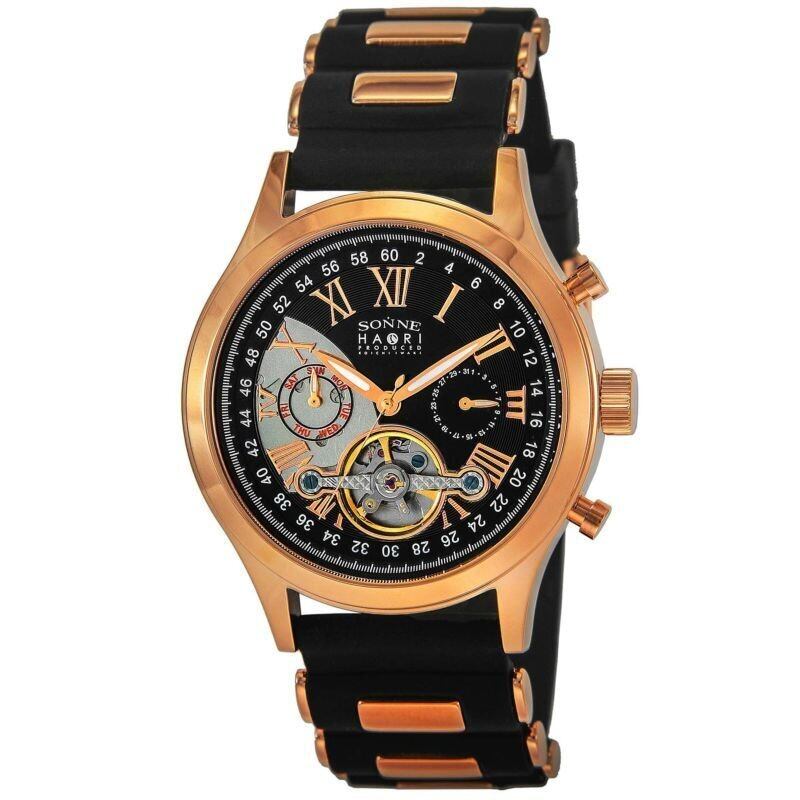 日付に加え、曜日も一目でわかるデイデイト表示、時計の心臓部であるテンプの規則正しい動きが見える6時位置に配した小窓が特徴です。ラバーストラップが軽やかで着け心地がとてもいいです。