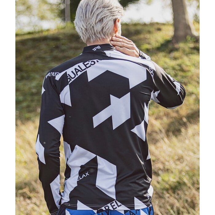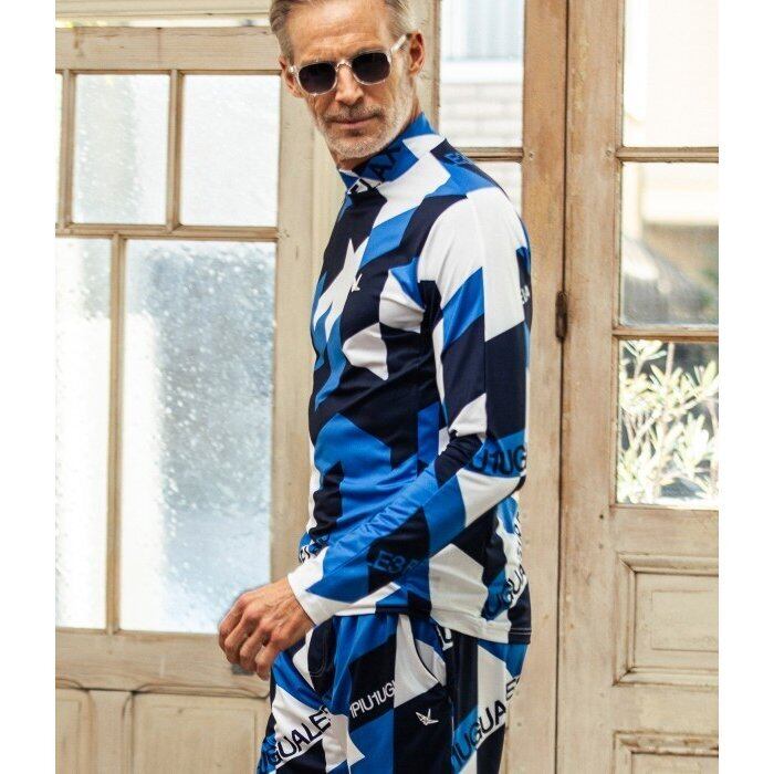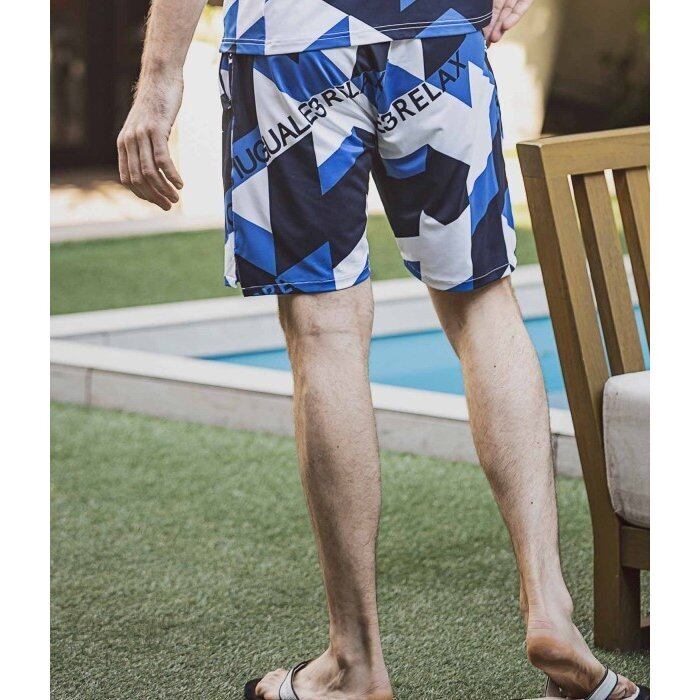 幾何学模様にロゴを配置した目を惹くデザインが海に映える一着。
