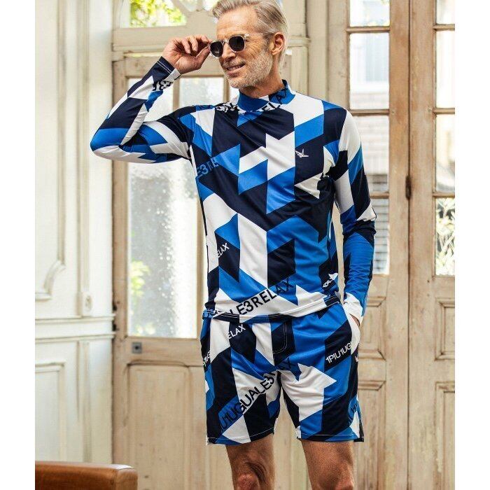 1PIU1UGUALE3 RELAX ウノピゥウノウグァーレトレ 総柄モックネックラッシュガード&ハーフパンツ セットアップ サーフィン レジャー 海水浴