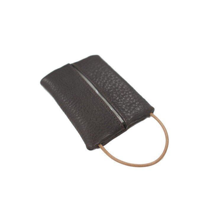 シンプルなテッシュカバーですが、ヌメ革の丸ひもをつけてみました。