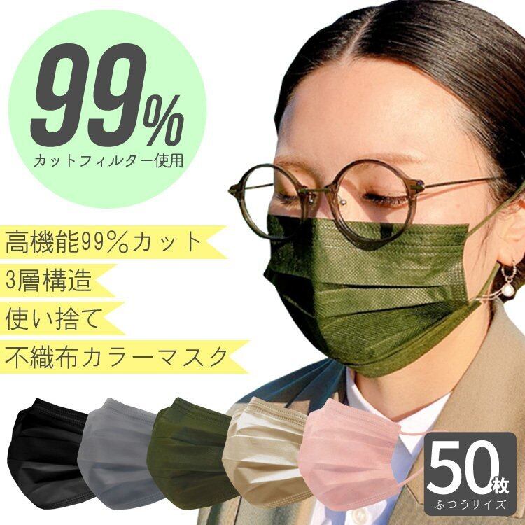 不織布 カラーマスク 50枚 使い捨て おしゃれ 普通サイズ 成人用 大人 ファッション 3層構造 花粉 PM2.5 風邪