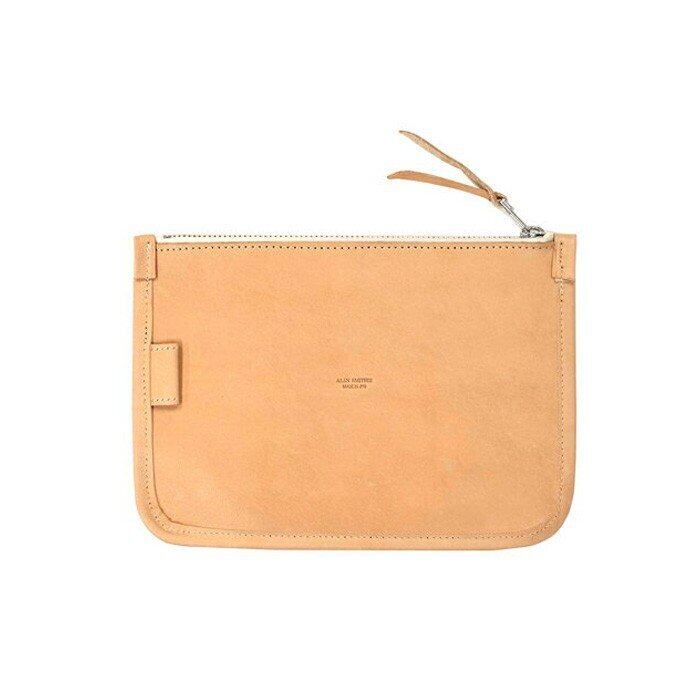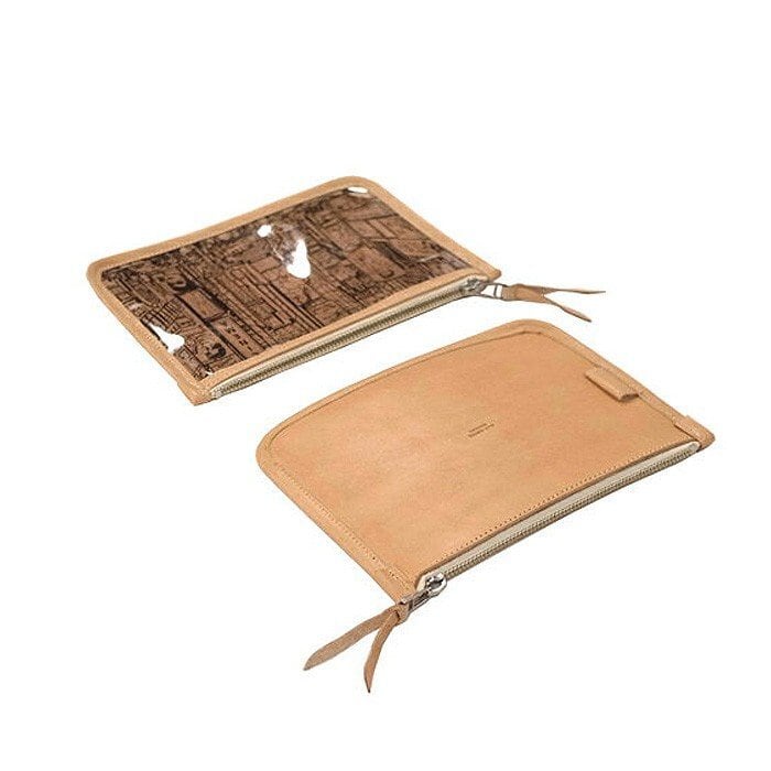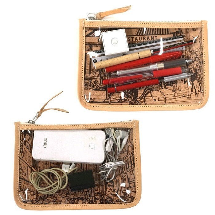 ヌメ革にレーザーで細かい線画を彫刻。それをベースに透明のビニールをかぶせポーチにしました。