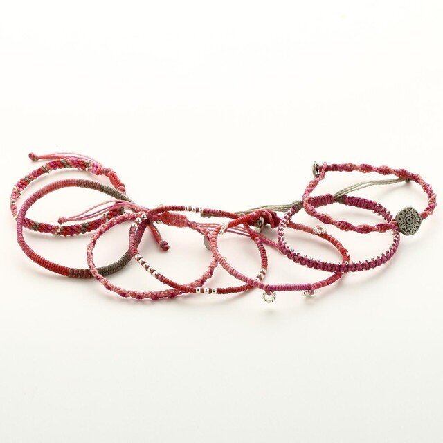ワックスコードとメタルビーズを編みこんだブレスレットは重ね着けでも1本ずつでも身に着けられ、他のブレスレットとの相性も抜群です。手作業で丁寧に作られたブレスレットは、ひとつひとつ異なる風合いが楽しめます。優れたデザイン性・クオリティとコストパフォーマンスも魅力です。