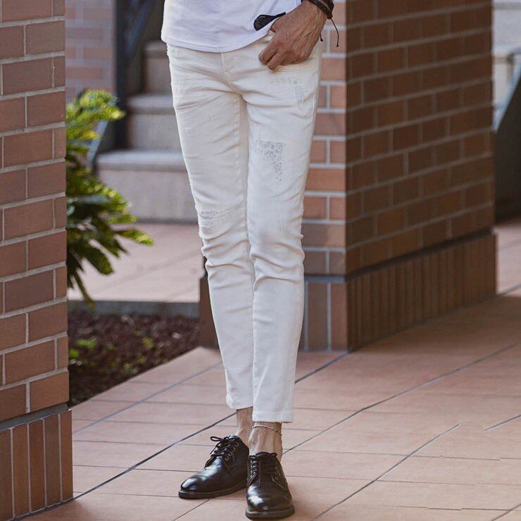 大胆なクラッシュ加工から覗くペイズリー柄がアクセントに。