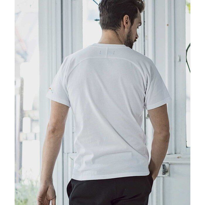 レインボーカラーのロゴは小さいながらもしっかりとした存在感を主張、シンプルなのに遊び心ある印象に仕上がりました。また、胸元にはブランドの象徴である折り鶴のワンポイントロゴをプリント。細かいところも手を抜きません。