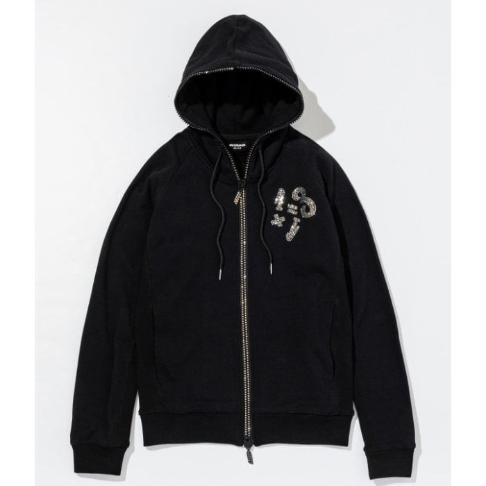 シンプルなボディにキラリ輝くランダムのラインストーンで、ブランド名の意を持つ「1+1=3」を配した、他にはないユーモアとラグジュアリーを携えたジップアップフーディーです。