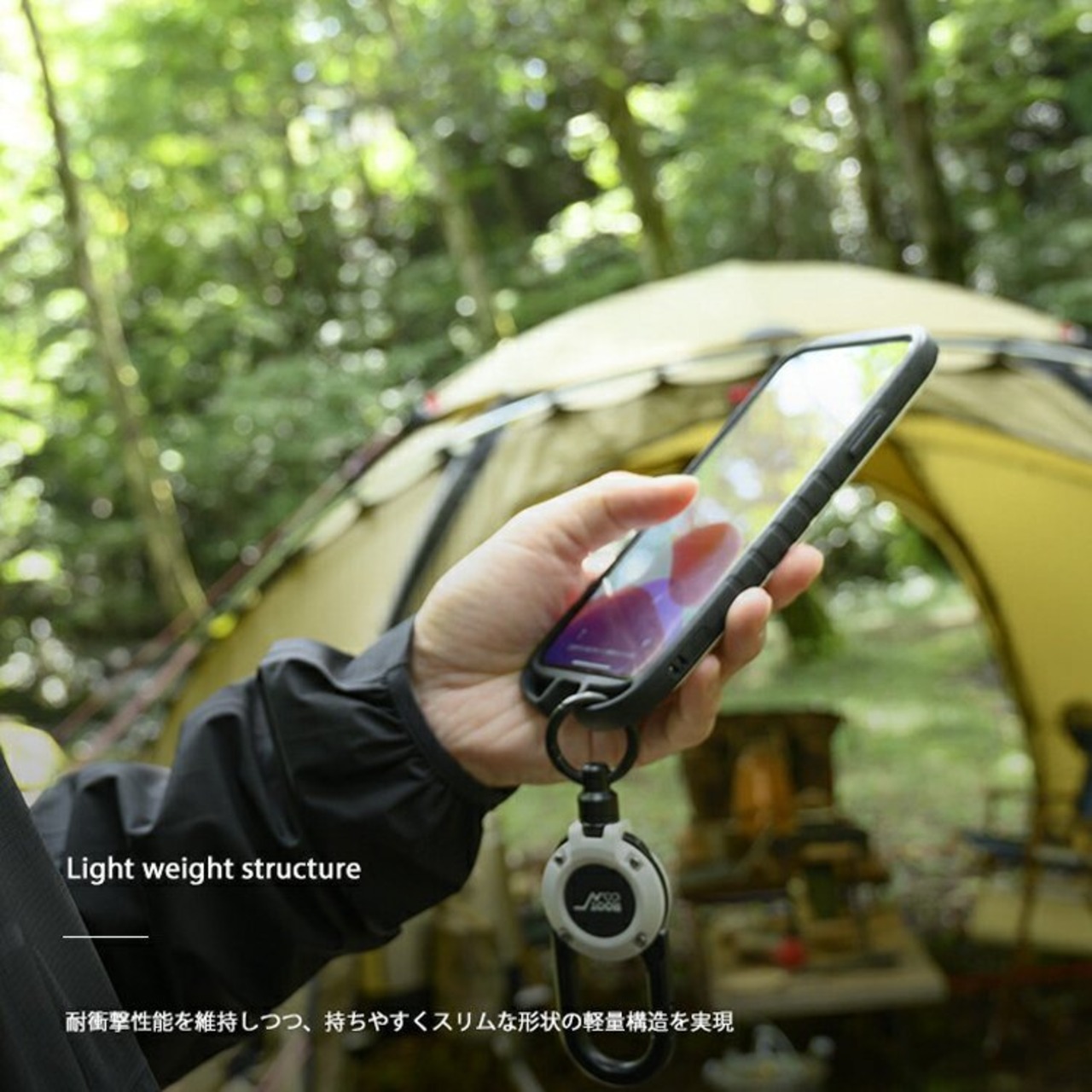米国環境耐性試験「MIL-STD-810G516.6ProcedureIV」の耐衝撃試験に準拠した耐衝撃性能はもちろん、下部に搭載されたカラビナループにはカラビナなどを直接ケースに取り付ける事ができるので、バックパックやショルダーバッグ・ベルトループ等にiPhoneをそのまま装着、登山やアウトドア時の落下防止が可能です。