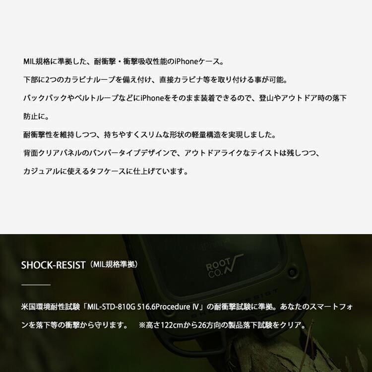 米国環境耐性試験「MIL-STD-810G516.6ProcedureIV」の耐衝撃試験に準拠した耐衝撃性能はもちろん、下部に搭載されたカラビナループにはカラビナなどを直接ケースに取り付ける事ができるので、バックパックやショルダーバッグ・ベルトループ等にiPhoneをそのまま装着、登山やアウトドア時の落下防止が可能です。