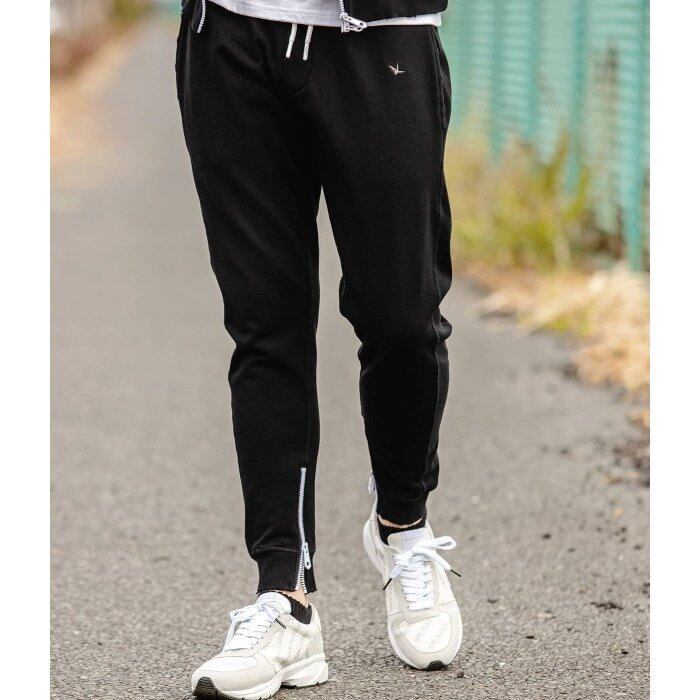 ポケット、ウエストにダメージ加工を施し、シンプルながらもスタイリッシュなコーディネートに。フロントにブランドの象徴である「折り鶴」のワンポイント刺しゅう入り。更に裾にはファスナーをつけ、ファッションのアクセントに。