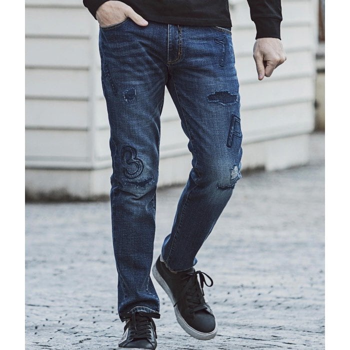 1PIU1UGUALE3 RELAX ウノピゥウノウグァーレトレ ロゴアップリケダメージデニム メンズ カジュアル ジーンズ クラッシュ ペイント ストレッチ スリム