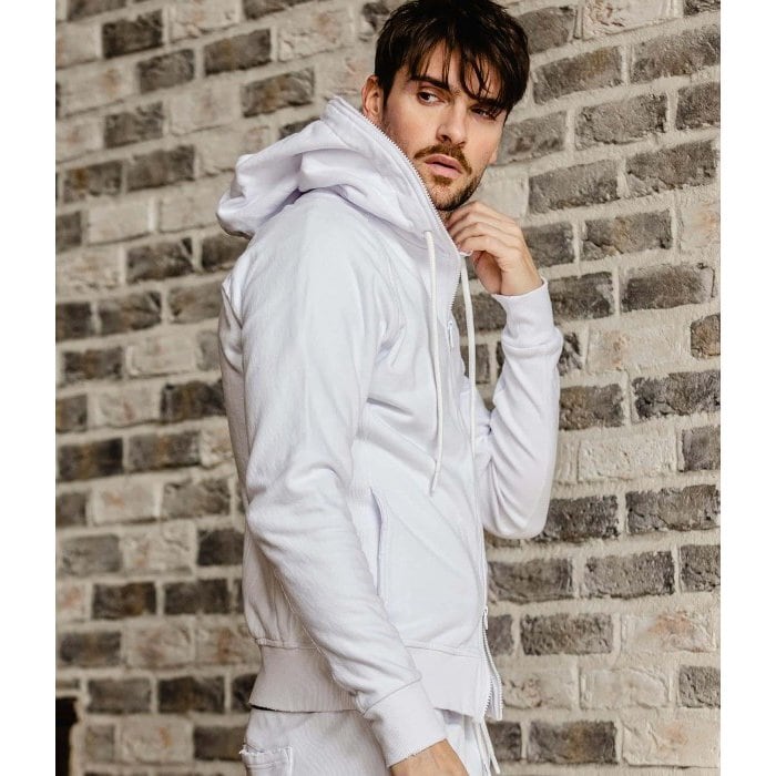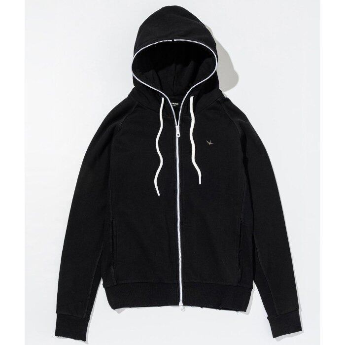 裾、ウエスト、カンガルーポケット部分にダメージ加工を施し、シンプルながらもスタイリッシュなコーディネートに。フロントにブランドの象徴である「折り鶴」のワンポイント刺しゅう入り。