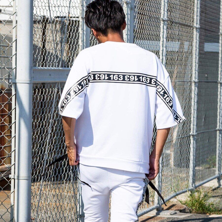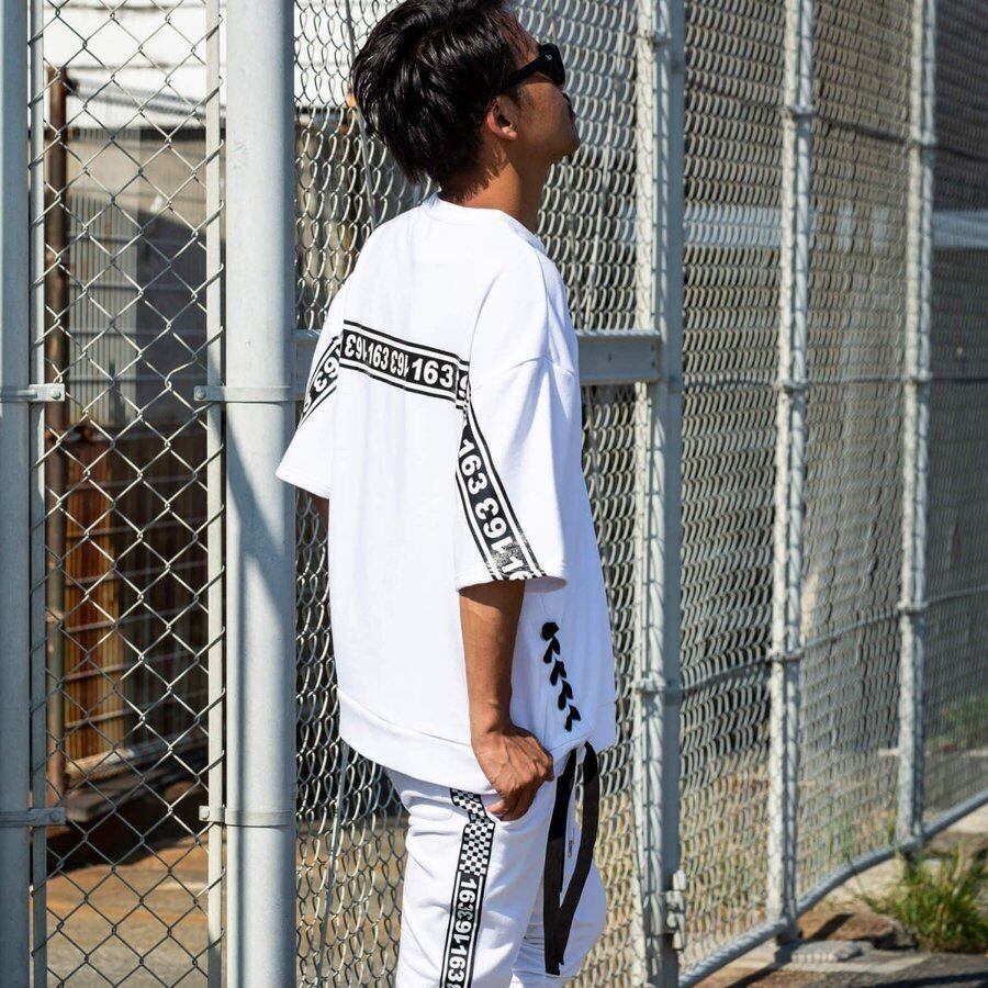 バックヨークから袖先にかけてデザインされたロゴテープのプリントと、レースアップになった両裾のデザインが特徴的なビッグT。