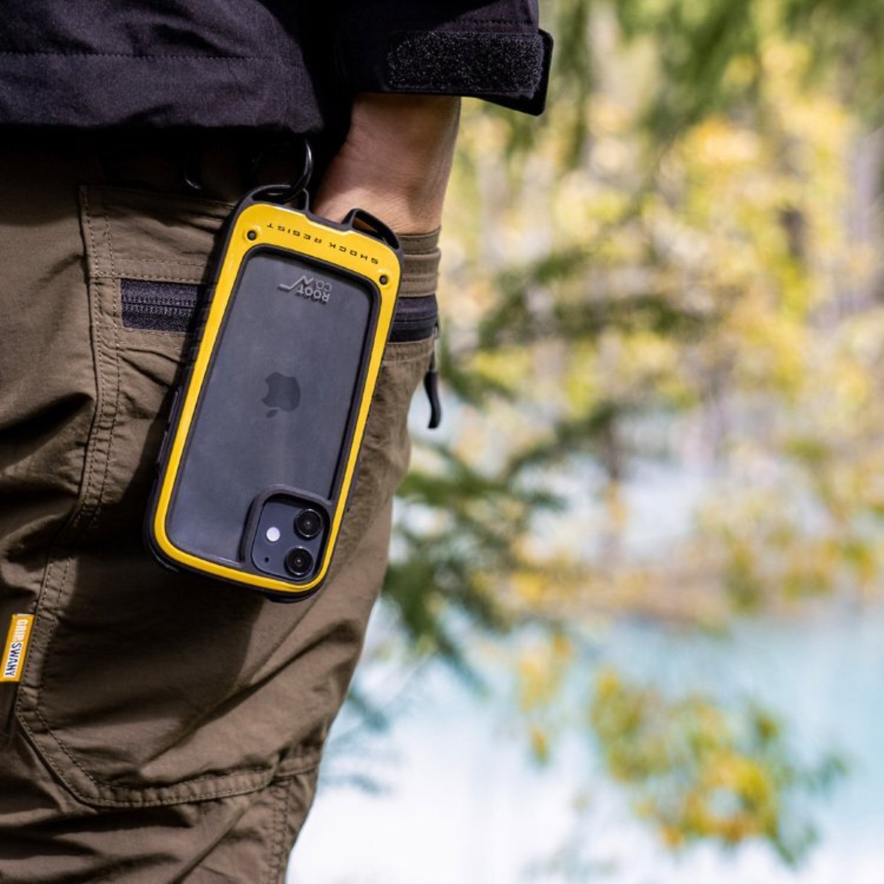 米国環境耐性試験「MIL-STD-810G 516.6Procedure IV」の耐衝撃試験に準拠した耐衝撃性能はもちろん、下部に搭載されたカラビナループにはカラビナなどを直接ケースに取り付ける事ができるので、バックパックやショルダーバッグ・ベルトループ等にiPhoneをそのまま装着、登山やアウトドア時の落下防止が可能です。