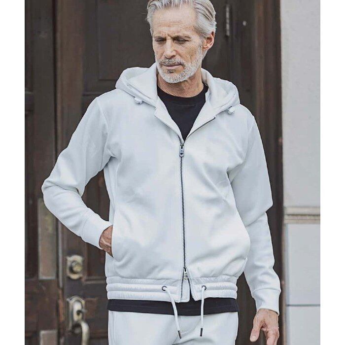 ウエストとフード、袖、サイドに光沢生地のキルティングを使用した異素材シリーズのジップアップフーディー。