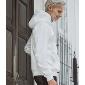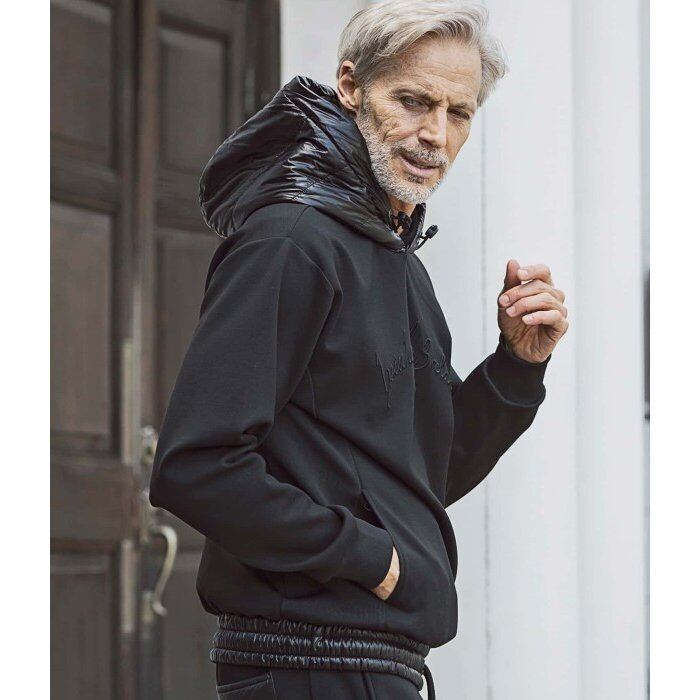 ウエストとフード、カンガルーポケット部分に光沢生地のキルティングを使用した異素材シリーズのプルフーディー。