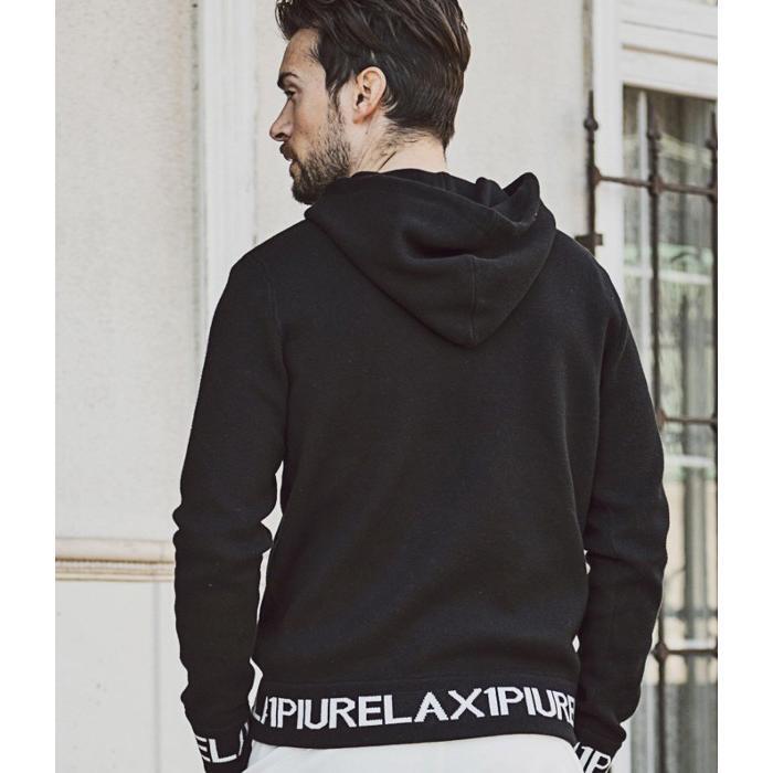 ウエスト部分と裾にジャガード織でロゴをあしらったスポーティーな一品。ジャガード織でシンプルなボディながらも、フロントには立体の筆記体ロゴをあしらって遊び心を忘れません。フードは頭の形にフィットするよう独自のパターンを採用。フードを被った姿もスタイリッシュに。