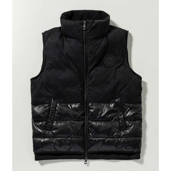 身頃部分にはっきりとした白プリントで派手目にしたものとトーンを合わせた同色で大人っぽさを演出した2カラー展開のベスト。内側にストレッチパックを使用しミドラーとして程よいボリュームのフェイクダウン。