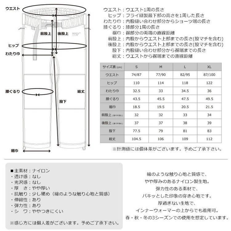 サイズ(cm)/ウエスト/股下/股上/わたり/裾幅/重量(g)